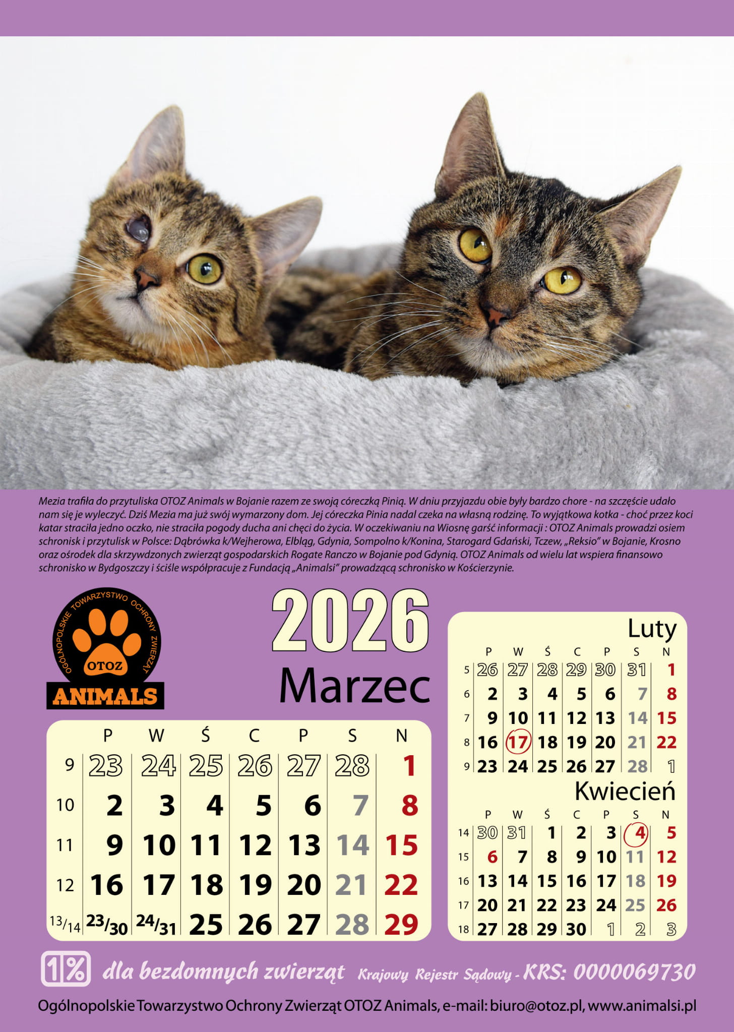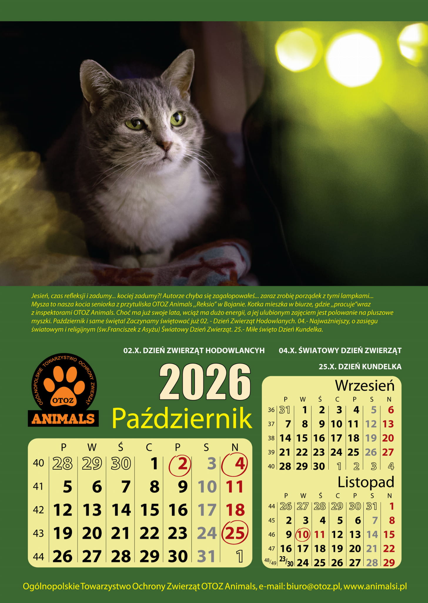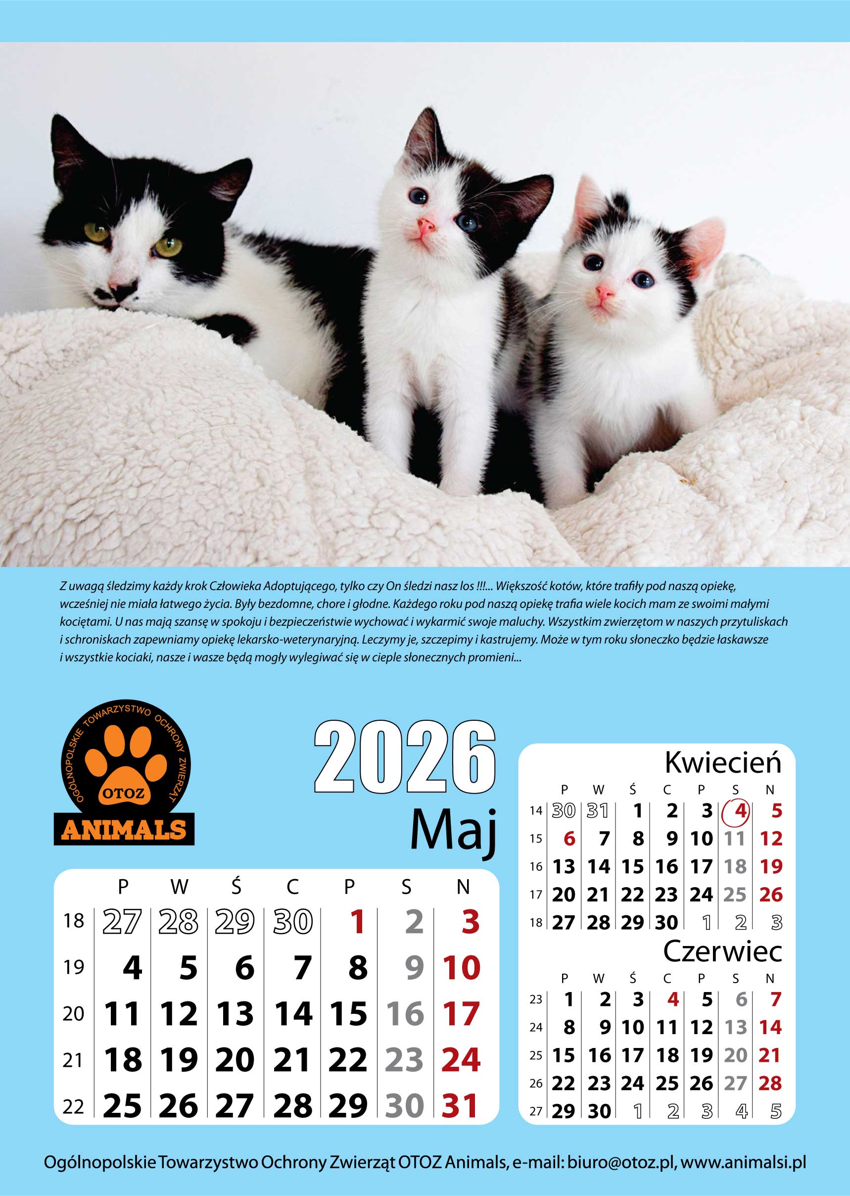 KOCI KALENDARZ CHARYTATYWNY 2024 ! Koty zajęły należne im miejsce i cieszą się indywidualnym kalendarzem, a nie jak poprzednimi laty na doczepkę do Psiego kalendarza. Koty są zwierzętami Wolności, wobec czego wiele z nich źle się czuje w schroniskach, spada im odporność, chorują. Mamy nadzieję, że poprzez propagowanie KOTÓW, między innymi poprzez ten Kalendarz wpłyniemy na ich lepszy los i odnalezienie tego właściwego domu…Format kalendarza 297mmx420mm (A3)..